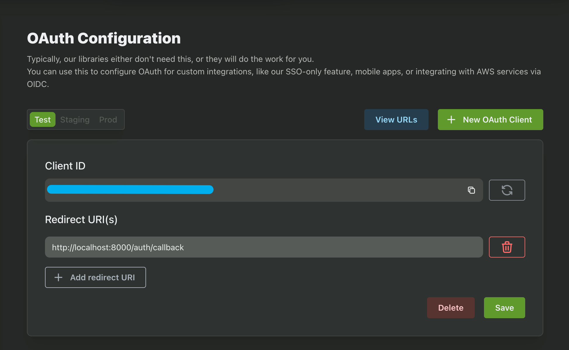 While we're here, let's also add a Redirect URI. In this guide we'll be using http://localhost:8000/auth/callback.