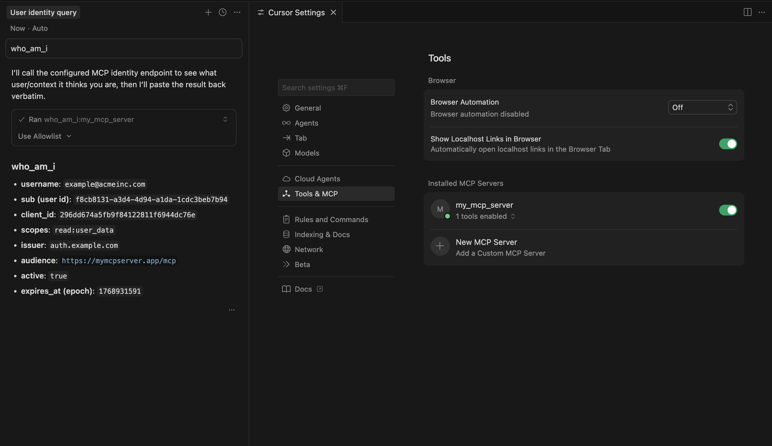 When we connect to our MCP server in Cursor, we can call the who_am_i tool to retrieve the authenticated user's information.