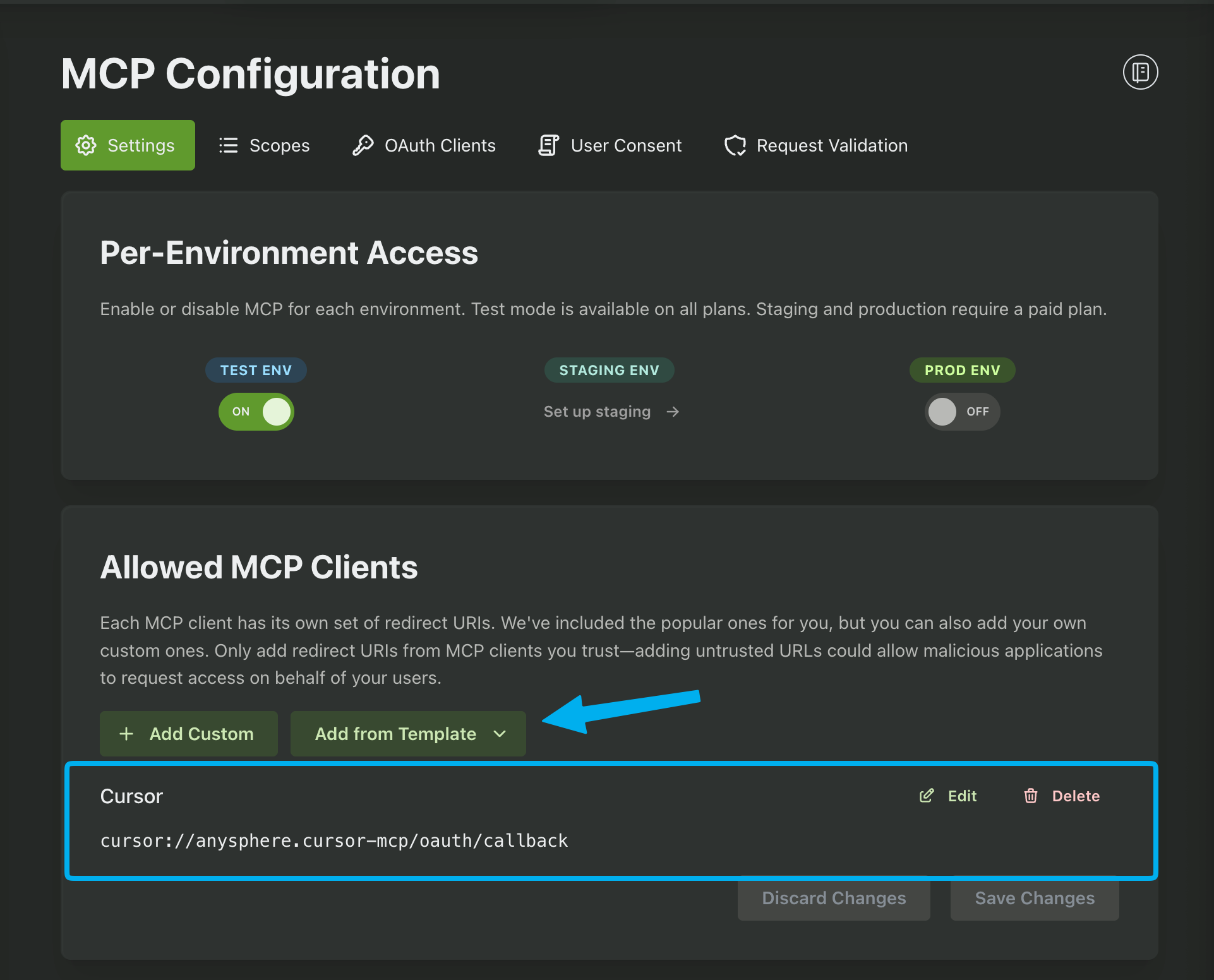 The next step is to add a Redirect URI to the Allowed MCP Clients. This is the URL that your users will be redirected to after successfully logging in. We include several templates for the most common AI tools, including Claude Desktop, ChatGPT, and Cursor. In this guide we'll be using the template for Cursor.